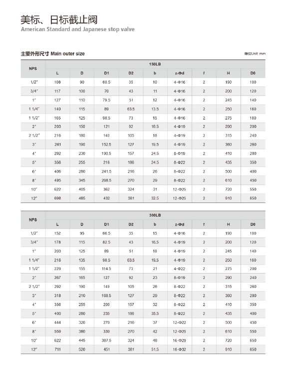 公称压力 150LB 300LB 10K 20K强度试验 3.0 7.5 24 5.8密封试验 2.2 5.5 1.5 4.0气密封试验 0.6 适用介质 水、蒸汽、油品、硝酸类、醋酸类适用温度 -29℃~425℃